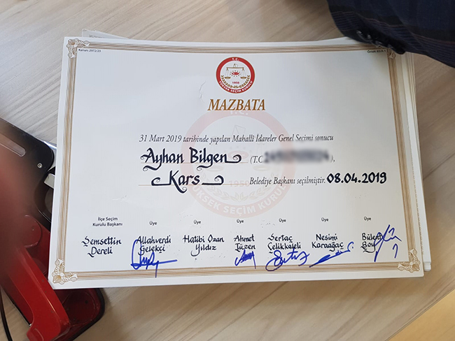 31 Mart’ta yapılan Mahalli İdareler Genel Seçimleri’nde 12 bin 181 oy alarak Kars Belediye Başkanı seçilen Ayhan Bilgen’in mazbatası Kars Adliyesi İlçe Seçimliği tarafından hazırlandı.