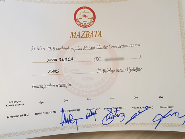 Bilgen ayrıca mazbatasını, kontenjandan seçilen Şevin Alaca’nın da aralarında olduğu diğer meclis üyeleriyle birlikte alacağı öğrenildi.