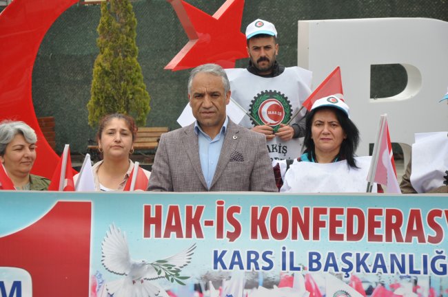 HAK-İŞ Kars İl Başkanı Barış Üstebay ve üyeleri Faikbey Caddesi GAMP Konağı yanındaki Valilik Parkında basın açıklaması yaptı.
