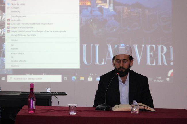 Ardından konuşmalarını gerçekleştirmek üzere kürsüye gelen Müftü Bayram, “Anmak aramak demektir. O’nu anmak İçin toplanmış bulunuyoruz. Çünkü siz O’nu arıyorsunuz. Onu anlamak İslam’ı anlamak, Kur’an-ı anlamak demektir. En değerli vaktimizi en değerli olana ayırmak durumundayız. Anmamız onu anlamamıza vesile olsun.” dedi.