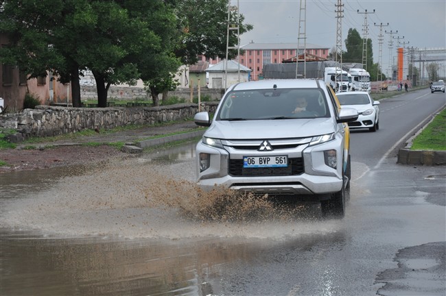 Kars’ta etkili olan sağanak yağış sonrası biriken su birikintisi çocukların eğlencesi olurken, araç sürücüsüne de zor anlar yaşattı.