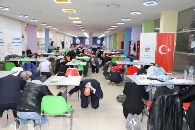 Kars Valisi ve Belediye Başkan Vekili Türker Öksüz’ün de katıldığı tatbikatta deprem anonsu yapıldı. Anonsun vatandaşlar ve il protokolü aynı anda çök-kapan-tutun talimatlarını yerine getirdi.
