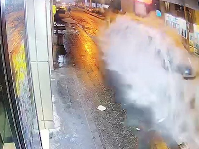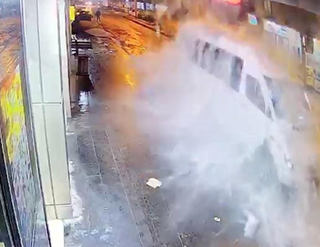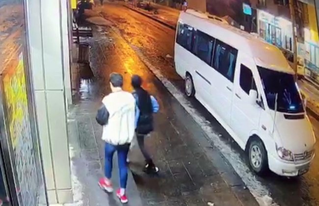 Çatıdan düşen buz kütleleri yol kenarında park halinde olan bir minibüsün üzerine düştü. Saniyeler önce iki çocuğun da oradan geçtiği o anlar güvenlik kamerasına yansıdı.
