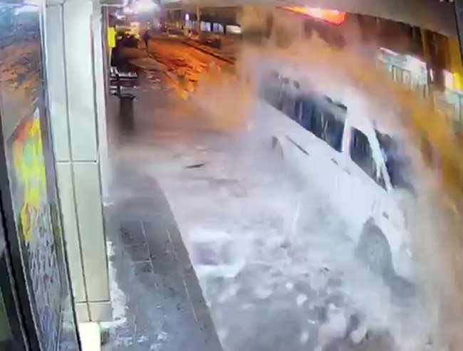 Yaya ve araç trafiğinin yoğun olduğu cadde üzerindeki olayda, buzlar minibüsün özellikle kaportasına zarar verdi. Buzların düşmesinden saniyeler önce iki çocuk ise oradan geçip markete girerek ölümden döndü.