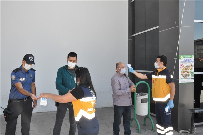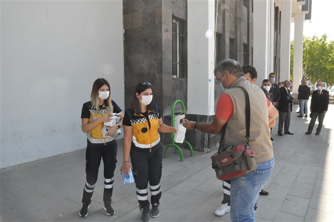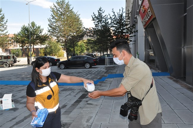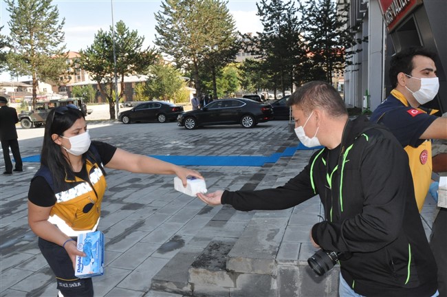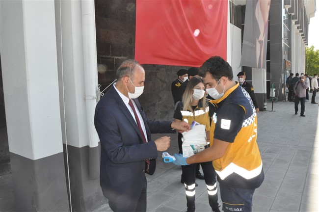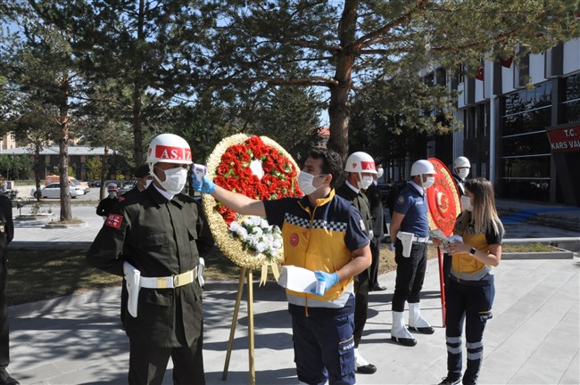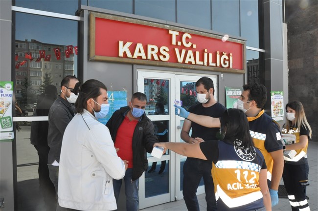 Tören öncesi Kars İl Sağlık Müdürlüğüne bağlı 112 Acil Sağlık ekipleri Kars Valisi Türker Öksüz başta olmak üzere tüm katılımcıların ateşi ölçtü, dezenfektan ve maske dağıttı.