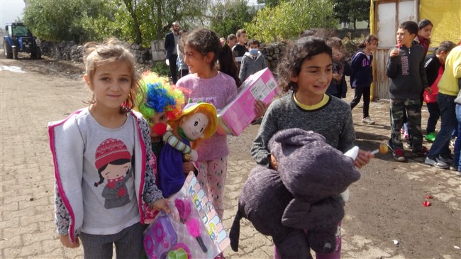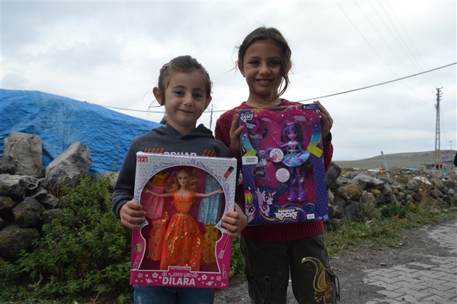 Gönüllülerden Fatih Taş, yaptığı açıklamada Türkiye'nin çeşitli illerinden gönderilen oyuncakları köy köy gezerek çocuklara hediye ettiklerini söyledi.