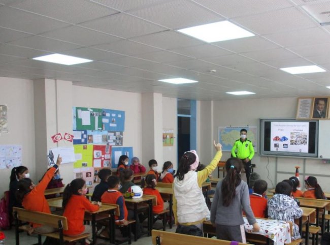 Kars İl Emniyet Müdürlüğü Sarıkamış Trafik Tescil ve Denetleme Büro Amirliği ekiplerince okullarda öğrenciler bilgilendiriliyor.