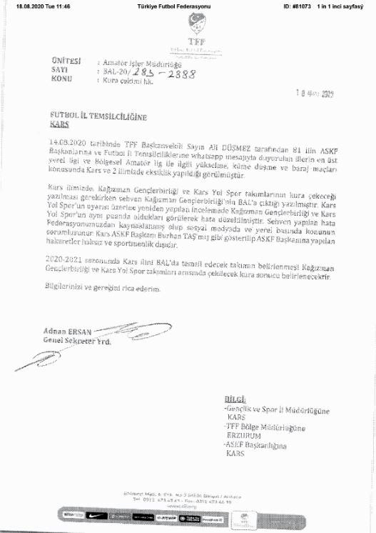 TFF yönetim kurulunun liglerin tescil edilmesiyle ilgili yapılan açıklama sonucunda Kars’ı Bölgesel Amatör Liginde (BAL) temsil edecek olan kulübün belirlenmesi üzerine Adnan Ersan imzasıyla Kars’a gönderilen açıklama şöyle: